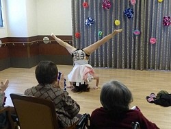 居住者を対象にした演芸イベントには、80〜90代の8人が“観客”として集まった。施設のスタッフに付き添われ、着席。のんびりとした時間が流れ、予定時刻より5分遅れの開演となった。