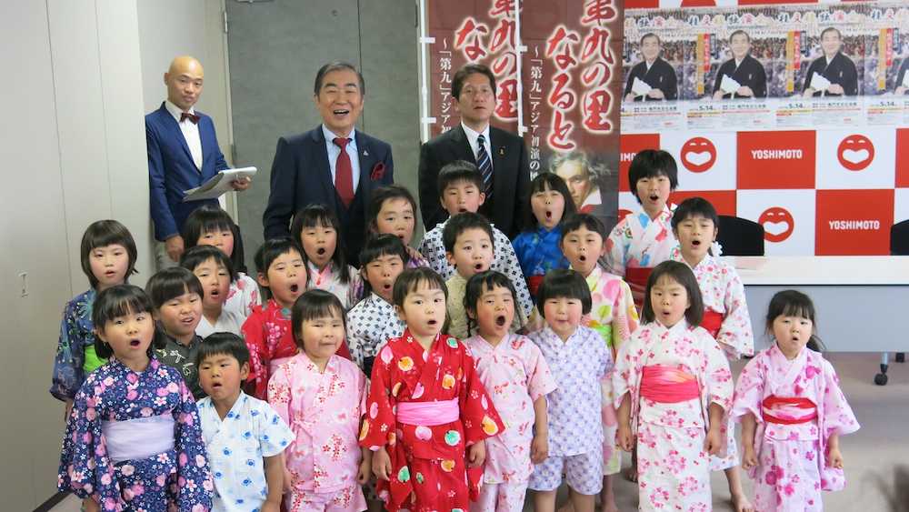 「なると第九PRマスター」に任命された桂文枝(後列左から2人目)は鳴門・泉理彦市長(後列右端)、鳴門の子どもたちと「第九」を合唱する