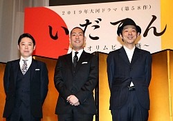 大河ドラマ「いだてん」発表会見に出席した(左から)阿部サダヲ、中村勘九郎、脚本の宮藤官九郎氏