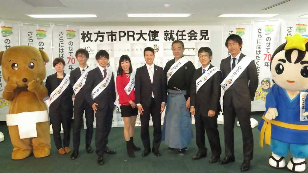 漫才コンビ「ハイヒール」のリンゴ(55)が10日、大阪・枚方市役所で行われた同市PR大使の任命式に出席した。伏見隆市長(48)は中学、高校、京産大の後輩という間柄。「PRして人口が増えたら(市内の)土地、くれますよね?」とむちゃなお願いをして笑いを誘った。