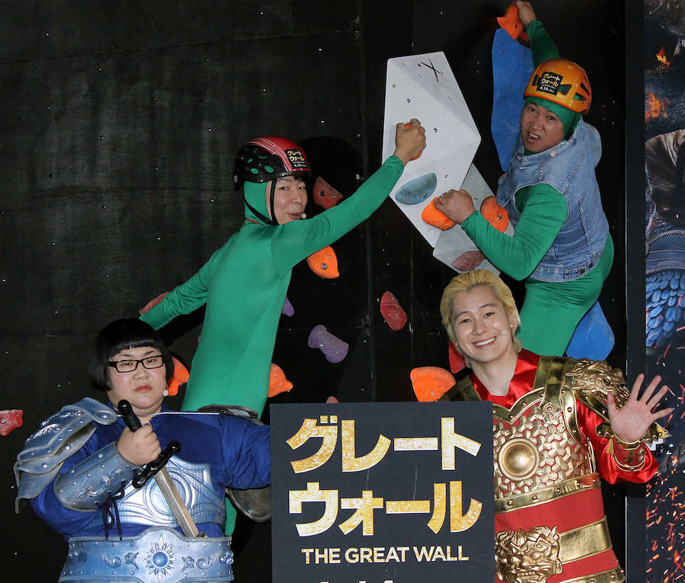お笑い芸人のダンディ坂野(50)、スギちゃん(43)と「メイプル超合金」が13日、都内で行われた映画「グレートウォール」(14日公開)のPRイベントに参加した。