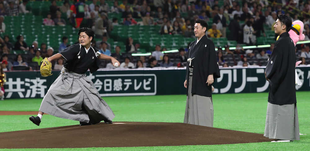 マウンドには春の高校選抜で甲子園を沸かせた福岡大大濠高の三浦銀次投手(3年)に「似ていると最近言われます」という次男・福之助が上がった。中学時代に軟式野球の経験があり、最速120キロをマークしたサウスポーは初の始球式で見事な速球を披露。「超緊張した。気持ちよかった。舞台とは違う。お客さんの『おー』という声が嬉しかった」と興奮気味に語った。見守った王会長からは「ナイスピッチング」と声を掛けられた。