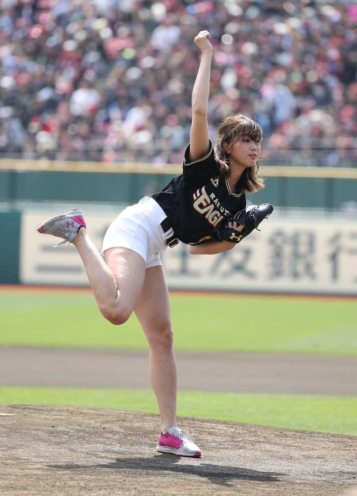 Koboパーク宮城で行われた楽天―日本ハム戦で「神スイング」で知られるタレントの稲村亜美(21)が始球式を行った。