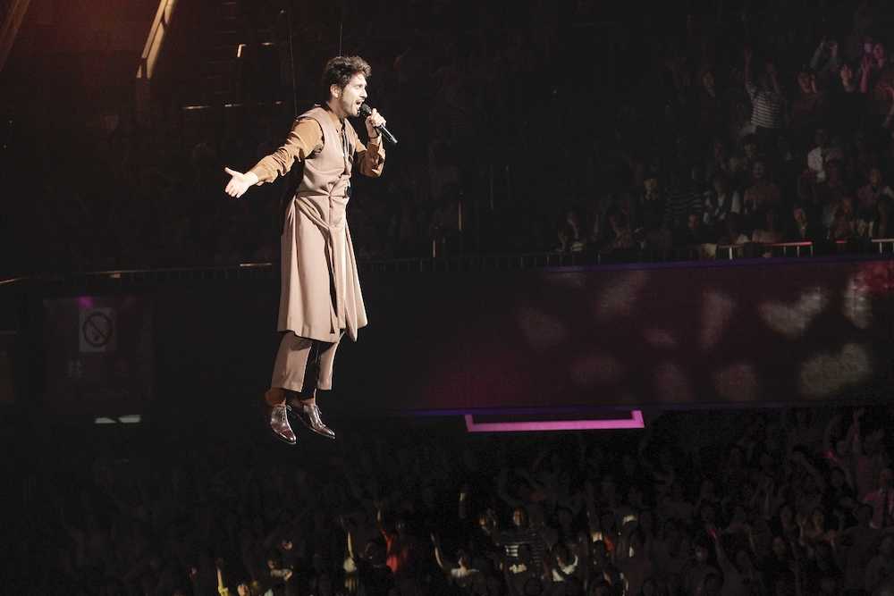 歌手の平井堅(45)が19日、日本武道館で特別公演を行った。スタンド席の観客の近くで歌おうと、21年のキャリアで初めて宙づりフライングに挑戦。約16メートル浮上したままヒット曲「KISS OF LIFE」を歌った。