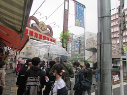 打ち合わせを終え、午後3時15分に本番撮影がスタート…といきたいところだったが、雨足が強くなったためスタート地点の商店街入り口でしばらく待機することに。撮影が悪天候に見舞われたのは今回が初めてなのだとか。