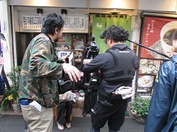 午後1時30分。小雨が降る中でリハーサル撮影がスタート。撮影は映像のブレを防ぐためステディカメラと呼ばれる特殊カメラによって行われ、カメラマンは機材が取り付けられたベストを着用して街を歩く。このステディカメラ、映画の撮影などで使用されることが多く、ロケ番組で使われることは非常に珍しい。重さは約20キロあり、これを担ぎながら30分間歩くとカメラマンの腰には相当の負担がかかるそうだ。