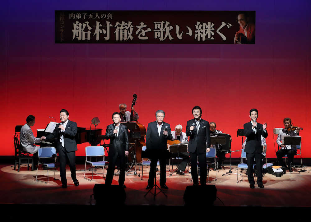 船村徹さん追悼コンサートを開いた内弟子の(左から)村木弾、天草二郎、鳥羽一郎、静太郎、走裕介 Photo by スポニチ 船村メロディー歌い継ぐ 85回目誕生日に追悼コンサート ギャラリーで見る この記事のフォト 2017年06月13日の画像一覧 もっと見る 2017年06月13日の画像をもっと見る