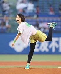 剛力彩芽 苦笑いツーバウンド始球式「全然。40点くらい」