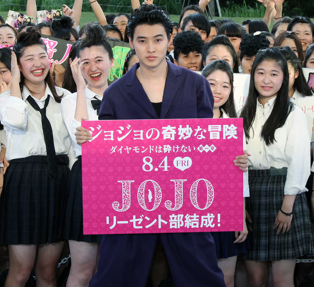 主演映画「ジョジョの奇妙な冒険」のキックオフイベントを行った山崎賢人 Photo by スポニチ 山崎賢人 300人のリーゼントJKらに囲まれニンマリ「素敵な髪形だね」 ギャラリーで見る この記事のフォト 2017年06月19日の画像一覧 もっと見る 2017年06月19日の画像をもっと見る