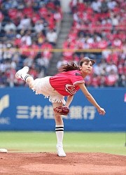 石川恋 初始球式はノーバンならず、赤ユニ&ショーパン魅せた