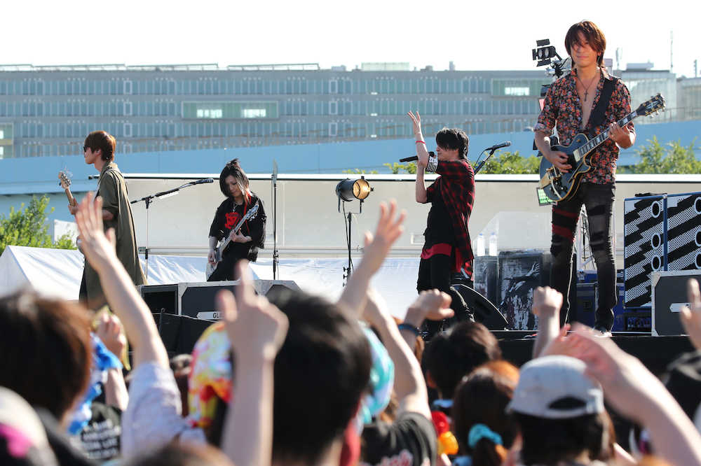 気温35度の炎天下、ボーカルのTERU(46)は「こんだけ密集してたら体感温度45度ぐらいだよね。熱中症には気をつけて」と呼びかけた。最新アルバム「SUMMERDELICS」の収録曲に加え、ヒット曲「生きてく強さ」「HOWEVER」など全7曲のステージ。ベースのJIRO(44)は「20万人ライブを思い出す。おれたちの後ろに太陽があって、みんなの顔がどんどん赤くなっていった」と懐かしそうに振り返った。