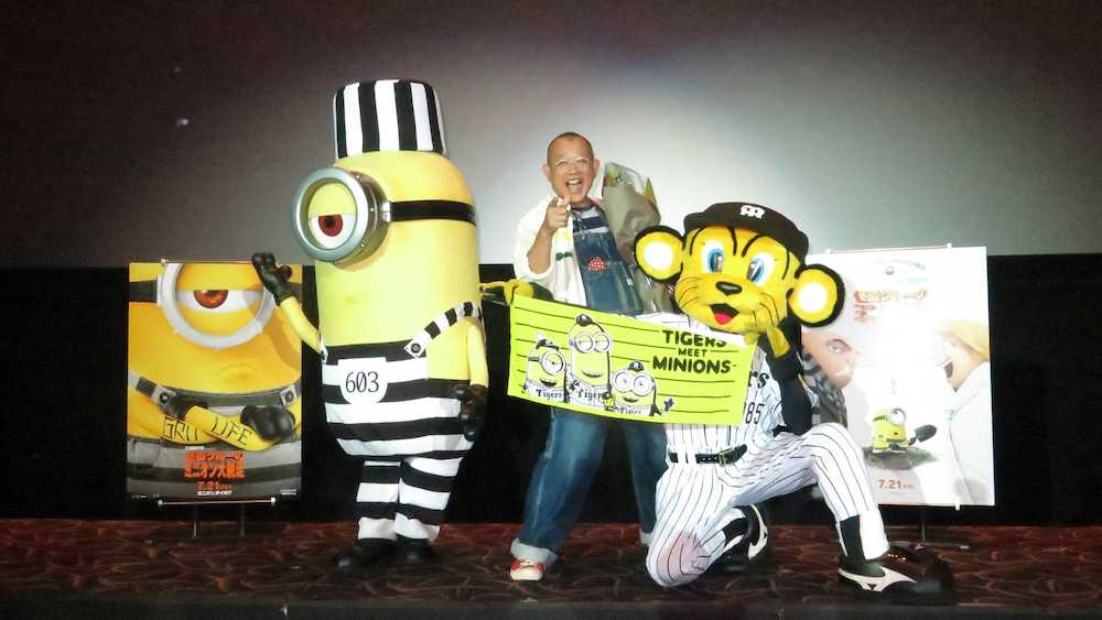 鶴瓶は怪盗グルーの吹き替えを担当。10年の第1作から数えて4作目となる。「街で子供から“グルー”って呼ばれる。声で分かるらしい」と明かし「さらに10年経ったら、皆…。エエ仕事ですわ」とニンマリだ。ちびっ子からの「どのミニオンが好きですか?」との質問に「スチュアート」と答えると、サプライズゲストにスチュアートとトラッキーが登場。トラッキーから花束と特製タオルをプレゼントされた。7月7日には甲子園球場で「怪盗グルーのミニオン大脱走ナイター」が開催され、グルーが始球式で剛速球を投じ、話題となったそうだ。着ぐるみの中に入っていたのはもちろん、鶴瓶でなく、帝京高野球部OBで甲子園経験のある投手だったとか。「そうや、あの日は能見が打ち込まれたやないか」と鶴瓶がトラッキーに詰め寄り、また、会場の笑いを誘った。