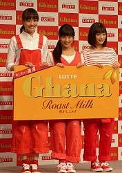 女優の土屋太鳳(22)、松井愛莉(20)、広瀬すず(19)が11日、都内でロッテ「ガーナミルクチョコレート」の新CM発表会に登場した。