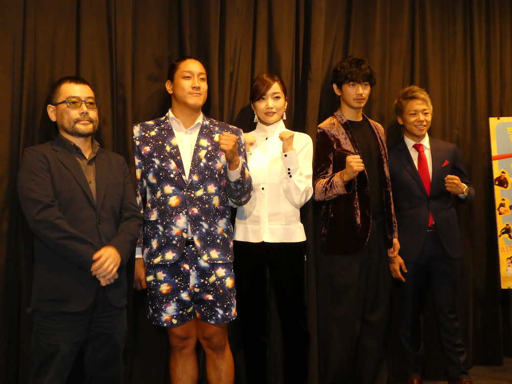 映画「リングサイド・ストーリー」の初日舞台あいさつに立った(左から)武正晴監督、黒潮“イケメン”二郎、佐藤江梨子、瑛太、武尊