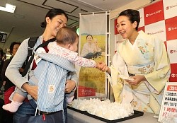 横浜高島屋では「美しき氷上の妖精 浅田真央展」と、新潟米コシヒカリで自身がプロデュースした“まおむすび”の販売がスタート。訪問はサプライズで、「稲穂のカラーをイメージした」という着物姿で“まおむすび”を来場者200人に手渡しでプレゼント。「たくさんの方にコシヒカリを食べていただきたい」と笑顔を見せた。
