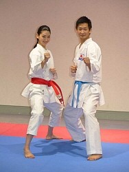 昨年の世界選手権で組手の男子84キロ級で金メダルを獲得した荒賀龍太郎(27)と試合形式の実技にも挑んだ。同社の朝比奈豊会長は「是永さんのりんとした姿勢は、私たちが目指しているものと通じる」と話した。