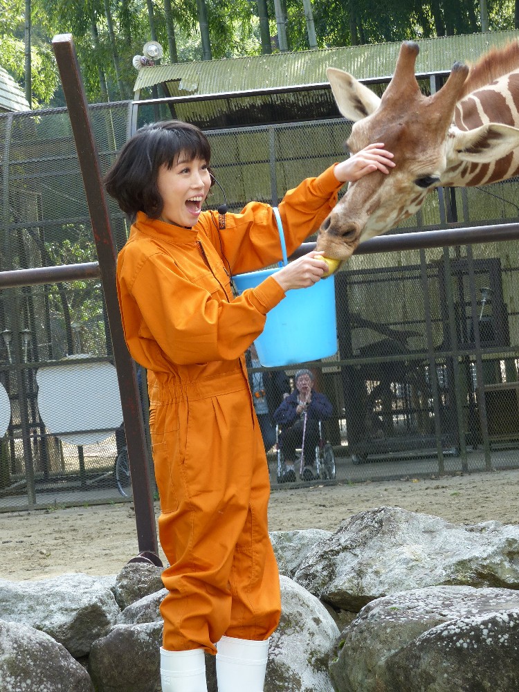 キリンをなでながらバナナを与える水森かおり