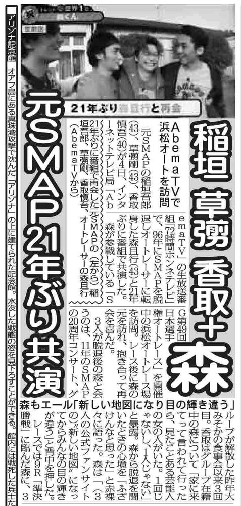 21年ぶりに共演した元SMAPの(右から)森且行、香取慎吾、草なぎ剛、稲垣吾郎(C)AbemaTV Photo by 提供写真 素顔と“ホンネ”が満載 ネットテレビの方が面白い ギャラリーで見る この記事のフォト 2017年11月12日の画像一覧 もっと見る 2017年11月12日の画像をもっと見る