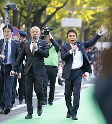 ちょっといい話はここまで。“漫才トリオ”に変身。松井知事が「2人のおかげで今、応援団が増えてます。今日も2500万人も来てくれた」とボケると、浜田が松井知事の頭を叩いてツッコミを入れ、会場は爆笑。さらに松井知事が「署名?今日は2500万人いてますからね」と再びボケて浜田がピシャリ。松井知事も「3人、同い年でね」と浜田のツッコミにまんざらでもなさそう。大阪らしい“万博誘致”のパフォーマンスに、大挙詰めかけた30万人の大観衆は最後まで笑いっ放しだった。