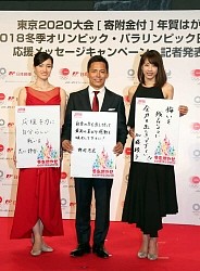 応援ボードを手にする(左から)荒川静香さん、野村忠宏氏、加藤綾子アナ