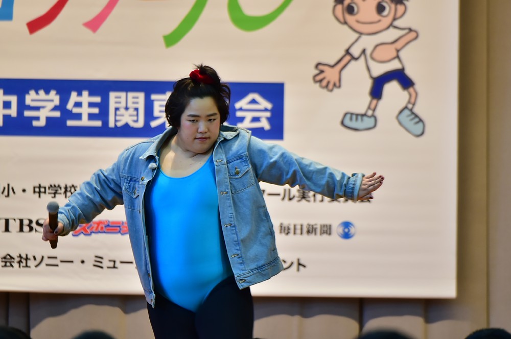 会場に水色のレオタード姿で現れたゆりやんはキレキレのダンスとネタを披露。「緊張している人にも効果があると思います」と自ら音頭をとって、およそ500人の中学生たちとともに、自身の持ちネタ「落ち着いていきや〜!」を大合唱した。