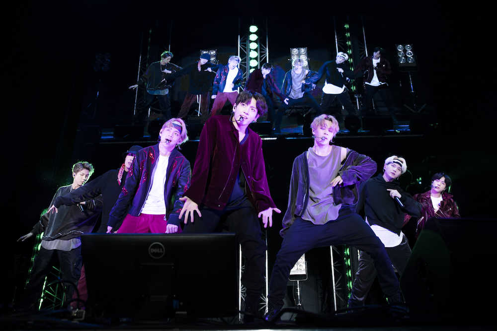 韓国の男性7人組ヒップホップグループ「防弾少年団」が13日、トリプルA面シングル「MIC Drop/DNA/Crystal Snow」の発売イベントを横浜アリーナで行った。