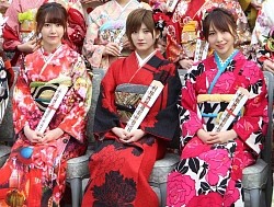 毎年恒例のAKB48グループの成人式イベントが8日、東京・神田明神で行われ、HKT48・AKB48兼任の宮脇咲良(19)、AKB48の高橋朱里(20)ら40人のメンバーが華やかな晴れ着姿で出席した。