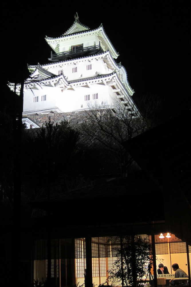 ライトアップされた掛川城。右下が王将戦の対局室