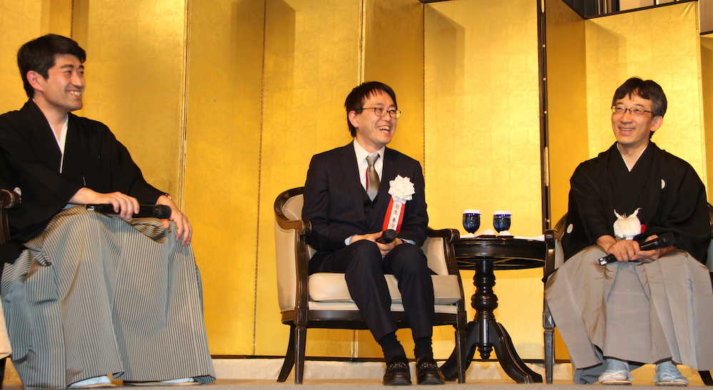 発起人の一人で、国民栄誉賞受賞が決まっている羽生善治竜王(47)を加えた豪華座談会や、記念色紙の抽選会などが和やかな雰囲気の中で行われた。連盟の会長、専務理事として多忙な日々を送る両人は「将棋にも将棋界にも無限の可能性がある。それを引き出すよう努力を続けたい」(佐藤)、「今の将棋界の繁栄を後輩に伝えていくのが自分の役目と思っている」(森内)とあいさつした。