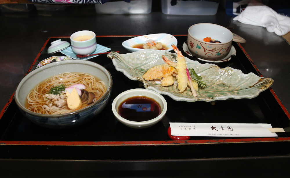 12:30 昼食休憩。控室に戻り「天ぷら・にゅうめん定食」=写真<1>