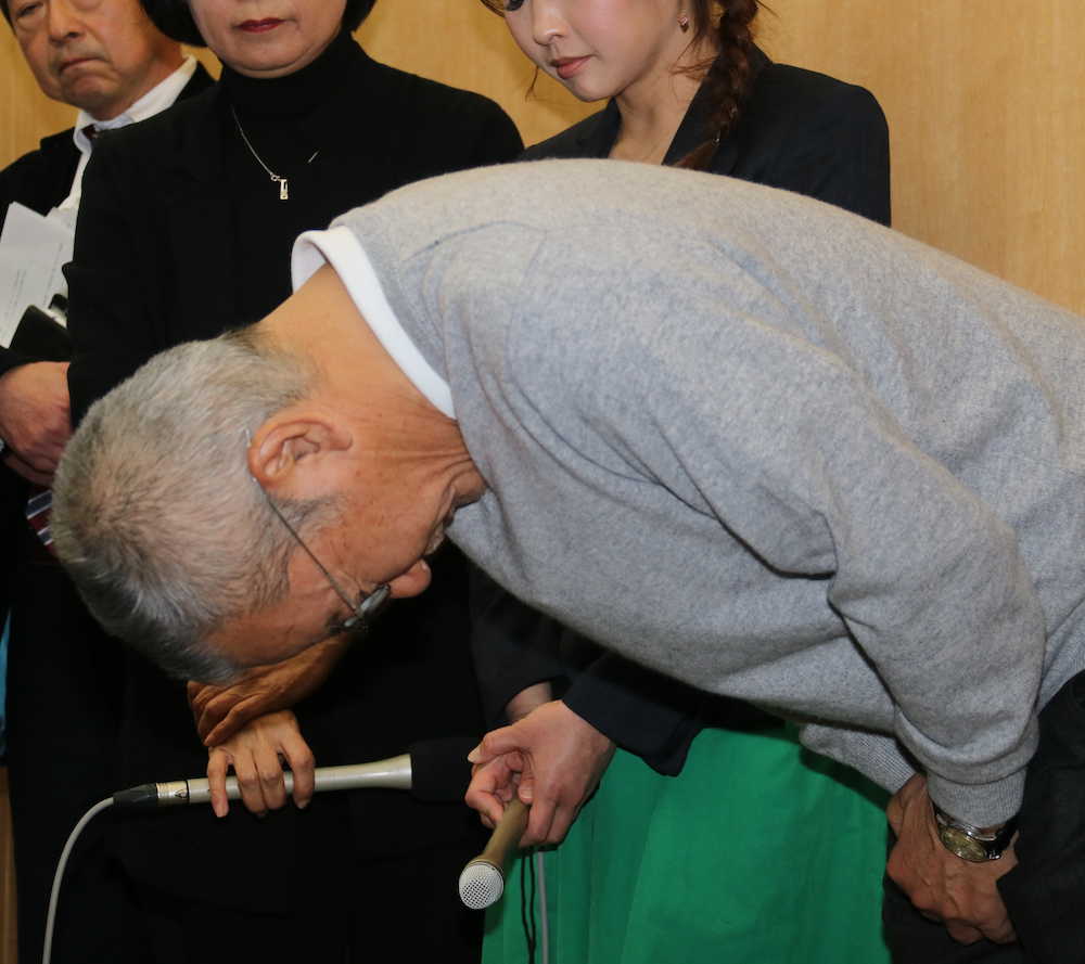 パーソナリティーを務める生放送ラジオの前に報道陣の取材に応じ、頭を下げる大竹まこと