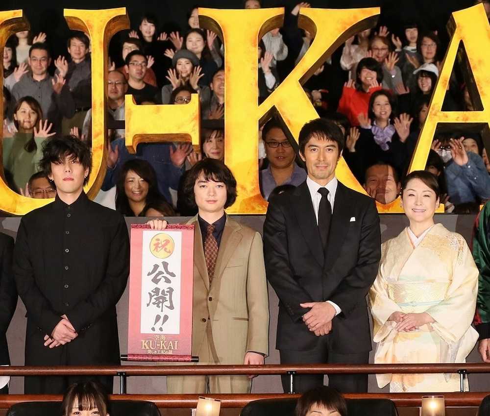 中国・唐を舞台に僧侶・空海が歴史を揺るがす巨大な謎に挑む物語。中国語の演技に挑戦した染谷は「全てが楽しくもあり、全てがつらかった。オリンピックももう終わりますし、これからは空海で熱くなってください」と充実の表情を見せた。阿部寛(53)、松坂慶子(65)らも登壇した。
