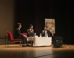 NHK大河ドラマ「西郷(せご)どん」(日曜後8・00)で有村俊斎を演じる俳優の高橋光臣(35)と薩摩ことば指導役の俳優・迫田孝也(40)が4日、山形県酒田市の酒田市総合文化センターでトークショーを行った。