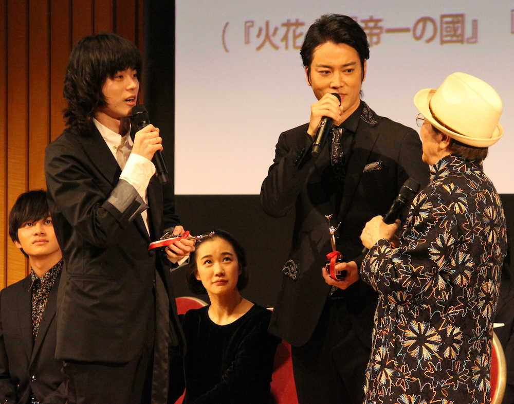 俳優の菅田将暉(25)が4日、大阪市内で開かれた「おおさかシネマフェスティバル」の授賞式に出席した。「火花」「帝一の國」「あゝ、荒野」の熱演で主演男優賞を受賞。欠席予定だった多忙を極める人気者が急きょ駆けつけ、大阪弁トーク全開で地元ファンを沸かせた。