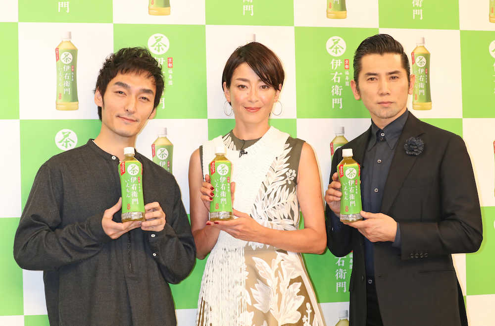 元SMAPの草なぎ剛(43)は「伊右衛門」の新CMキャストに“抜てき”され、シリーズ初登場。伊右衛門夫妻役の本木雅弘(52)、宮沢りえ(44)とともに先行記者発表会に登場した。