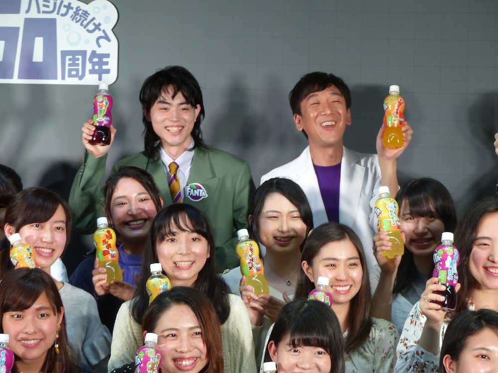 学生たちを前にファンタを手にする菅田将暉(左)と東京03の飯塚悟志