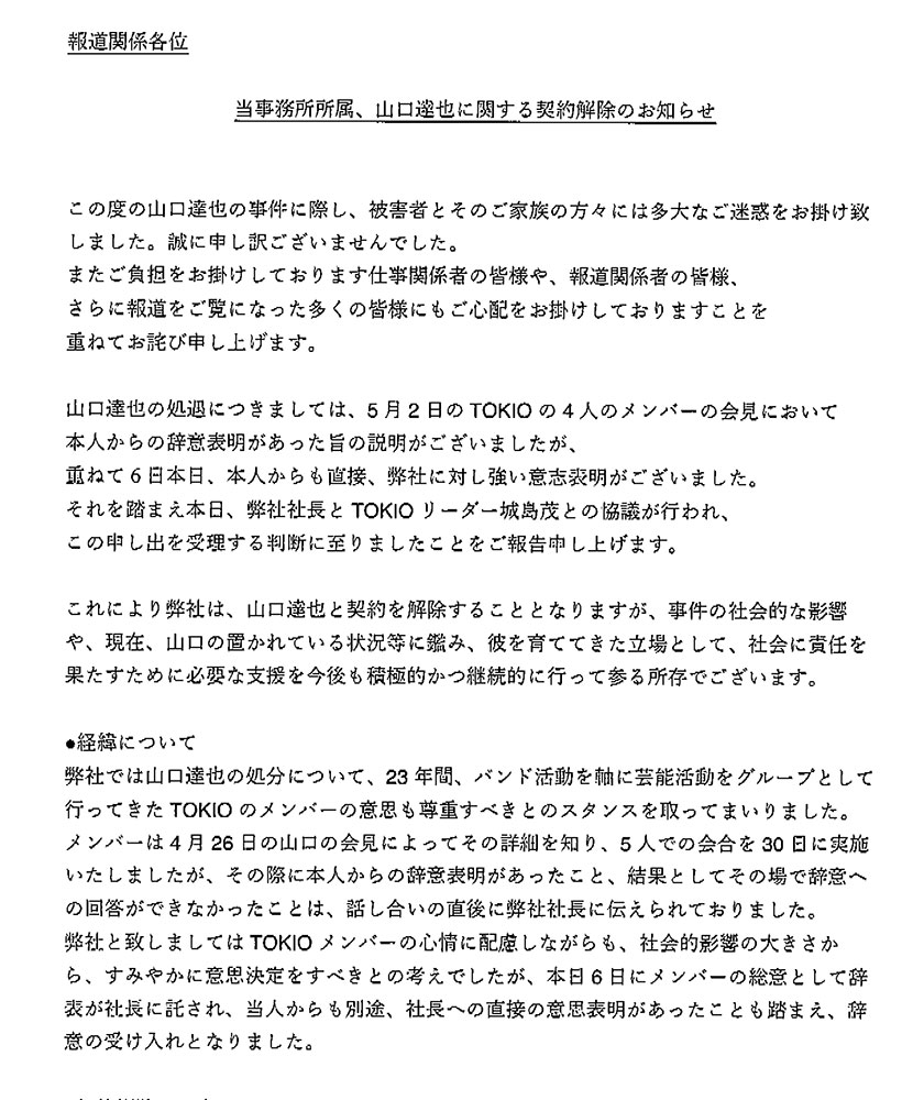 ▽5月6日 城島が預かっていた山口の「退職願」がメンバーの総意としてジャニーズ事務所に提出され、山口本人も事務所に強く辞意を表明。ジャニ―喜多川社長とリーダーの城島が協議した上で、事務所が山口との契約解除を発表。
