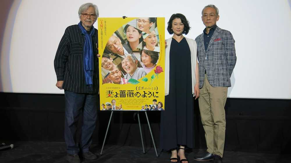 映画「妻よ薔薇のように 家族はつらいよ3」(25日全国公開)の先行上映会が10日、大阪市内であり、西村まさ彦(57)、夏川結衣(49)、山田洋次監督(86)が舞台あいさつ。山田監督は関西の主婦の代表ともいえるタレント・上沼恵美子(63)から絶賛コメントをもらったことを明かした。
