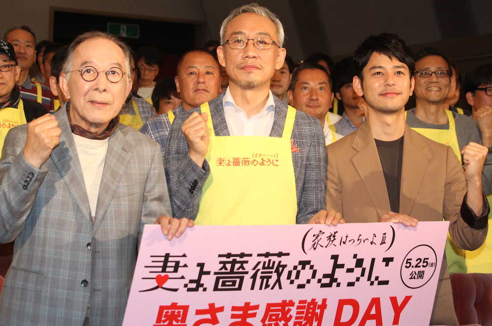 俳優の橋爪功(76)、西村まさ彦(57)、妻夫木聡(37)が13日、都内で映画「妻よ薔薇(ばら)のように家族はつらいよ3」(25日公開、監督山田洋次)の奥様感謝DAYイベントに出席した。