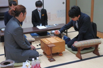 第44期棋王戦予選8組の決勝で中村亮介六段(手前)を破り、本戦トーナメントに進出した藤井聡太七段