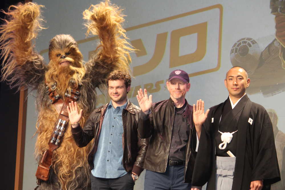映画「ハン・ソロ/スター・ウォーズ・ストーリー」来日記者会見に出席した(左から)チューバッカ、オールデン・エアエンライク、ロン・ハワード監督、市川海老蔵