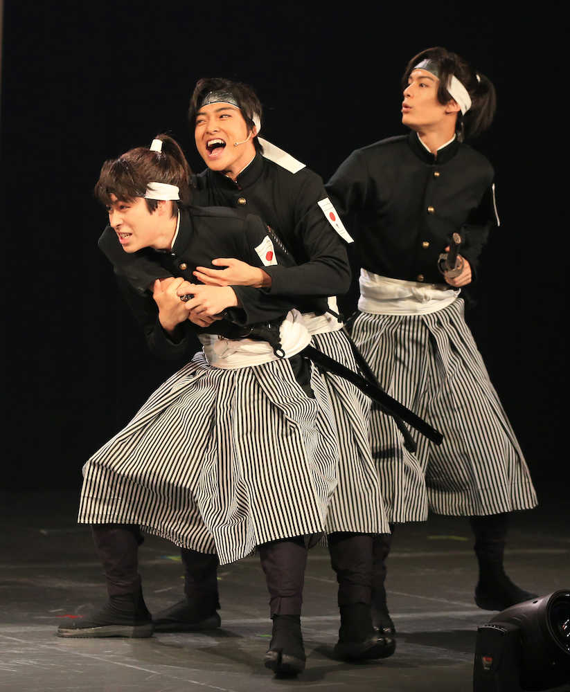 昨年11月に結成し、待望の旗揚げ公演初日を迎え、リーダーの栗山航(27)は「ワクワクが止まらない」と笑顔。現代にタイムスリップした白虎隊が廃部寸前の高校演劇部を救う内容。初舞台で主演を務める飯島寛騎(21)は「殺陣、ダンス、歌ありで盛りだくさん」とPR。この日はサッカーW杯も開幕。西銘駿(20)は日本代表に「初戦のコロンビアは強敵だけど、立ち向かう雄姿を見たい」とエールを送った。