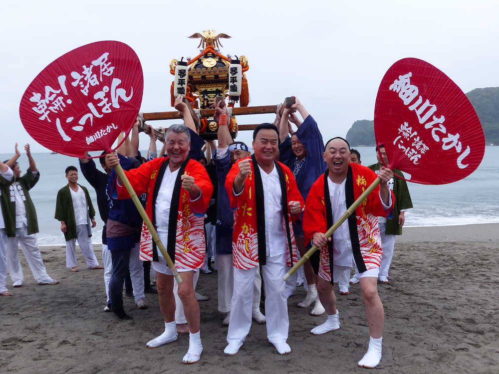 土砂降りの中、細川は傘も差さずに赤い法被で鴨川の海に現れた。地元の神輿(みこし)会メンバーを引き連れて砂浜を歩き、「ワッショイ!にっぽん!」と声を張り上げた。