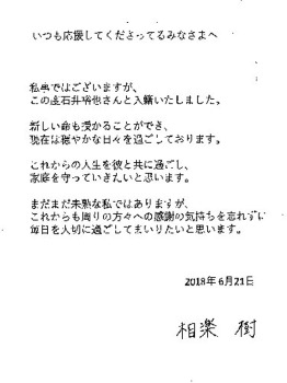 相楽は所属事務所を通じ、直筆署名入りでコメントを発表。石井監督と結婚したこと、またお腹に新しい命を宿っていることを伝え「これからの人生を彼と共に過ごし、家庭を守っていきたいと思います」と幸せいっぱいに報告した。