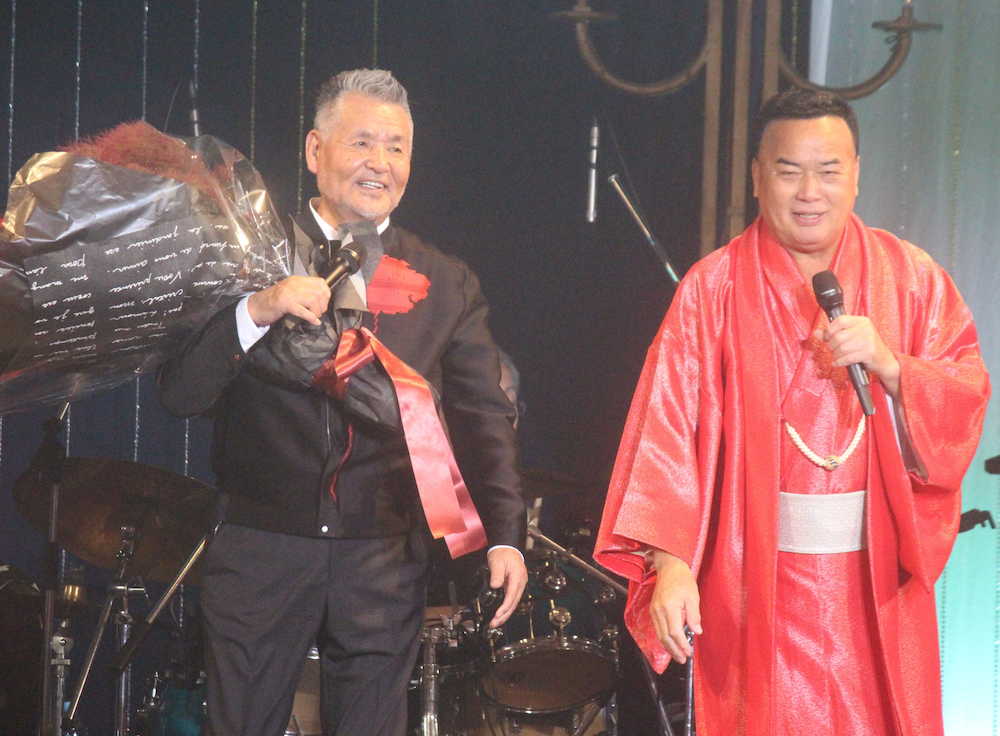 ゲスト歌手・細川たかし(68)から花束を受け取り、笑顔。「若いよね、いつまでも。来年80歳のわりに声も出てるし、なかなか死なない」という細川の手荒な祝福に、「帰れ、おまえ!」と返し、会場の爆笑を誘った。