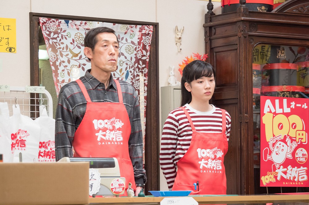 連続テレビ小説「半分、青い。」第82話の1場面。100円ショップ「大納言」の店番をする田辺(嶋田久作)と鈴愛(永野芽郁)(C)NHK