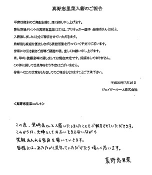 真野の所属事務所は報道各社にFAXを送付し、「弊社所属タレントの真野恵里菜はプロサッカー選手柴崎岳さんと入籍いたしましたことをご報告させていただきます」と報告した。