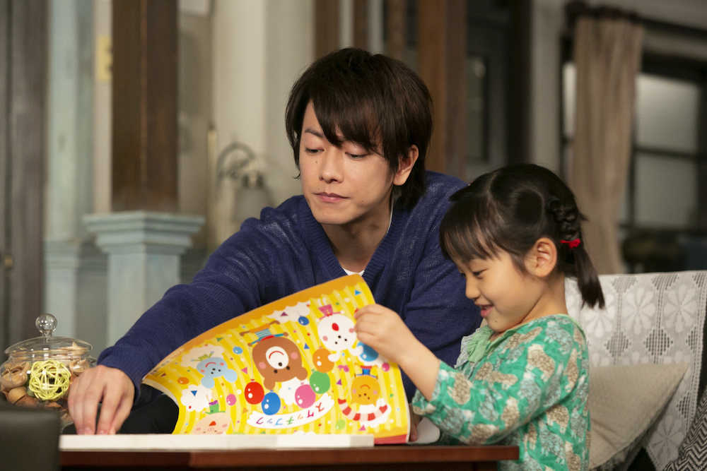 連続テレビ小説「半分、青い。」第116話の1場面。萩尾家に初のおつかいに来た花野(山崎莉里那)と律(佐藤健)(C)NHK
