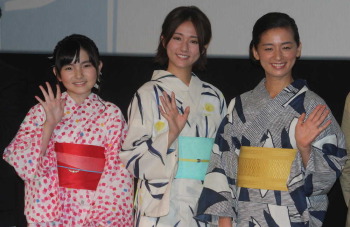 スタジオポノック短編アニメーション映画「ちいさな英雄−カニとタマゴと透明人間−」の公開記念舞台あいさつが25日、都内で行われ、声優を務めた木村文乃(30)、鈴木梨央(13)、尾野真千子(36)が出席。3人は華やかな浴衣姿で登場した。