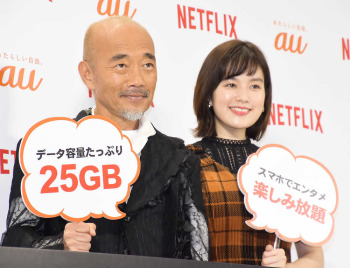 俳優の竹中直人(62)、タレントの筧美和子(24)が28日、都内で行われたKDDI「Netflixプラン」提供開始イベントに出席した。